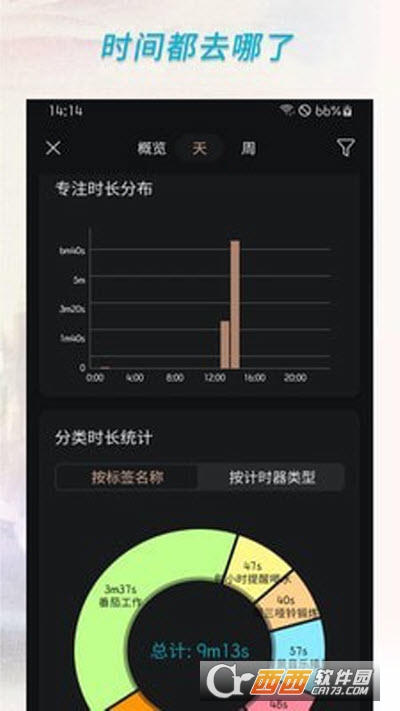 计时器日志和统计分析的功能。该应用会记录每一个计时器的使用日志,并根据计时器的标签以及类型进行归纳整理成柱状图以及饼状图,用户可以按照天、周等方式进行查看计时器的使用情况。