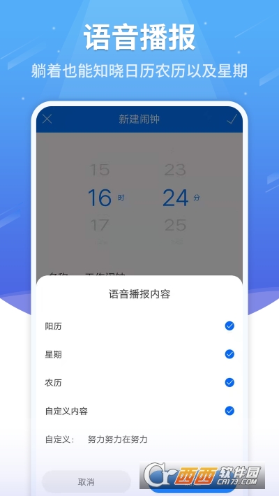 自定义内容播报:您可以输入早上您想让闹钟为您播出的一段话,试试输入一段激励自己的话。