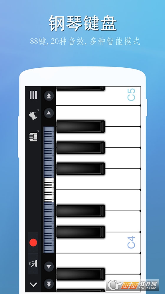 • 内置10种键盘音效: 钢琴, 八音盒, 管风琴, 钢丝弦吉他, 贝斯合成器,萨克斯,弦乐合奏,罗兹电钢琴,电子琴等