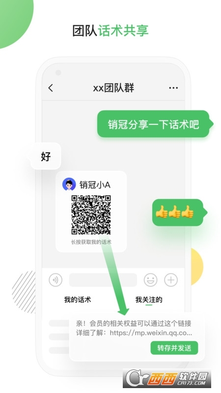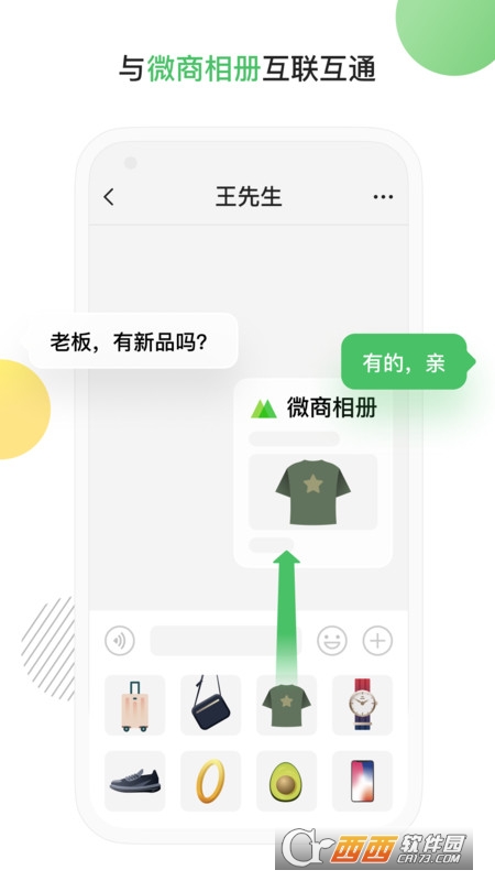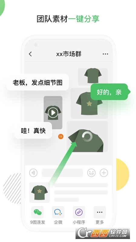 一键分享:提升你在聊天时分享、推荐、选款的效率,实现商家在微信聊天窗口的便捷分享,包括但不限于商品图文、多图、小程序、链接、品类标签、搜索结果等类型的分享。