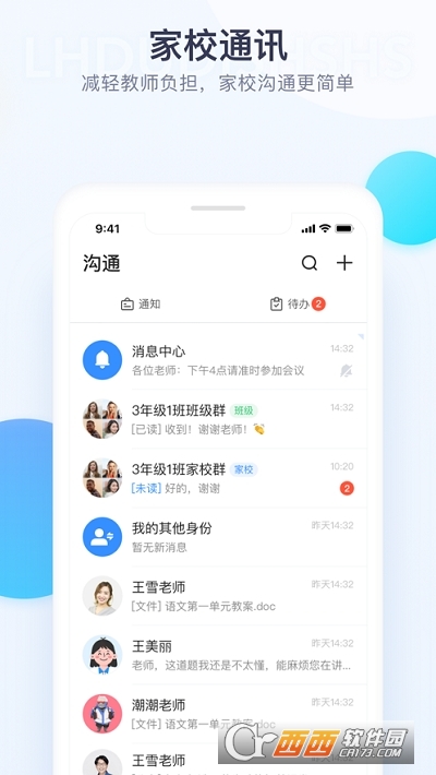 产品集即时家校沟通通讯、统一应用入口、移动办公、教师服务等功能于一体,为各级各类学校、一线教师、广大学生与家长构筑了学习、交流、分享的网络空间与实践社群,通过信息化手段促进教师教学方式与沟通方式的变革,促进教与学、教与教、学与学的全面互动。
