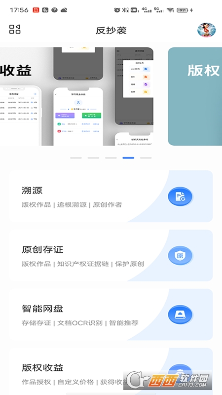反抄袭(原创版权保护)是一款很好用的知识产权服务平台,能够轻松管理原创版权收益与服务,使用方法简单,拥有的服务项目多,可以实时为用户记录原创过程,并且可以留证,随时查找证据,支持溯源服务,还有相关版权收益查看,鳄斗163手游网使用吧!