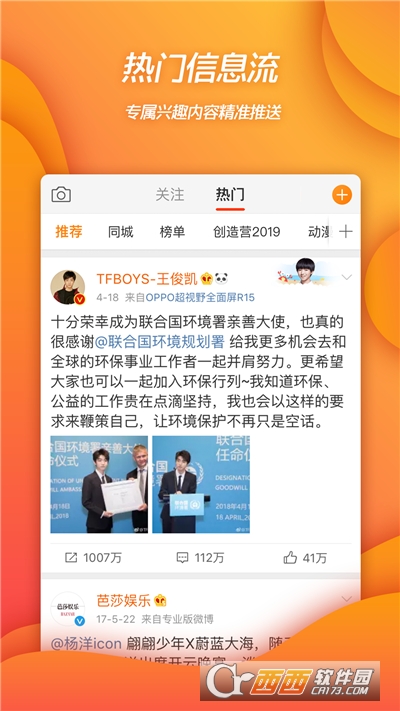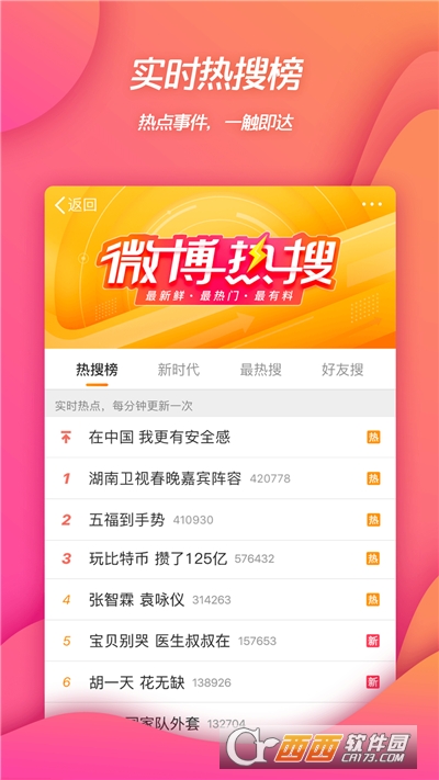 明星在这里,好友在这里,行业精英也在这里。还在犹豫什么,赶紧安装新浪微博客户端和他们互动吧!新浪微博带你一起开启随时随地微生活,瞬间与世界对话。基于Android平台的新浪微博手机客户端,集阅读、发布、评论、转发、私信、关注等主要功能为一体,本地相机即拍即传,随时随地同朋友分享身边的新鲜事。