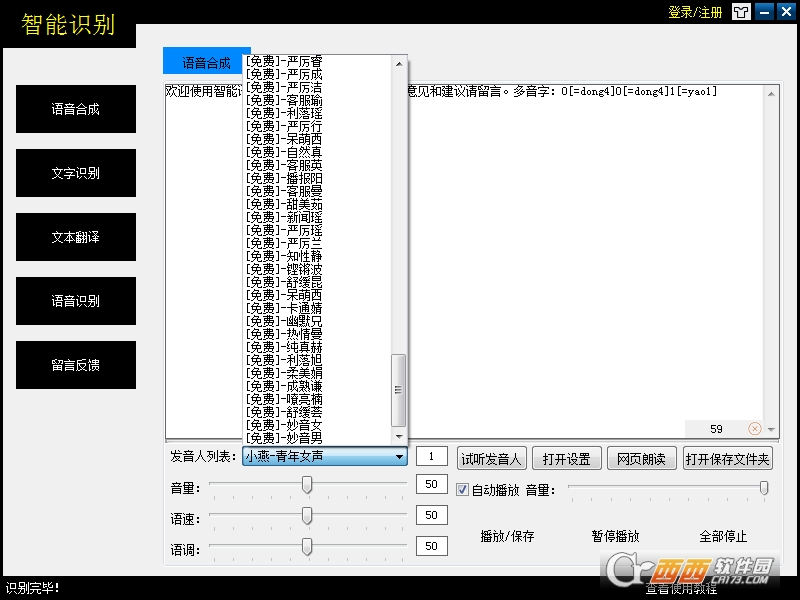 智能识别(文字音频识别)是一款非常好用的智能文字转语音软件,这类软件可用于制作视频配音、学习资料音频、有声小说的制作等...或者用于校对文章、学习外语、朗读文件、小说、播报网页新闻等其它,对于想将文本文件转换成语音格式的朋友来说,这款软件可看看。