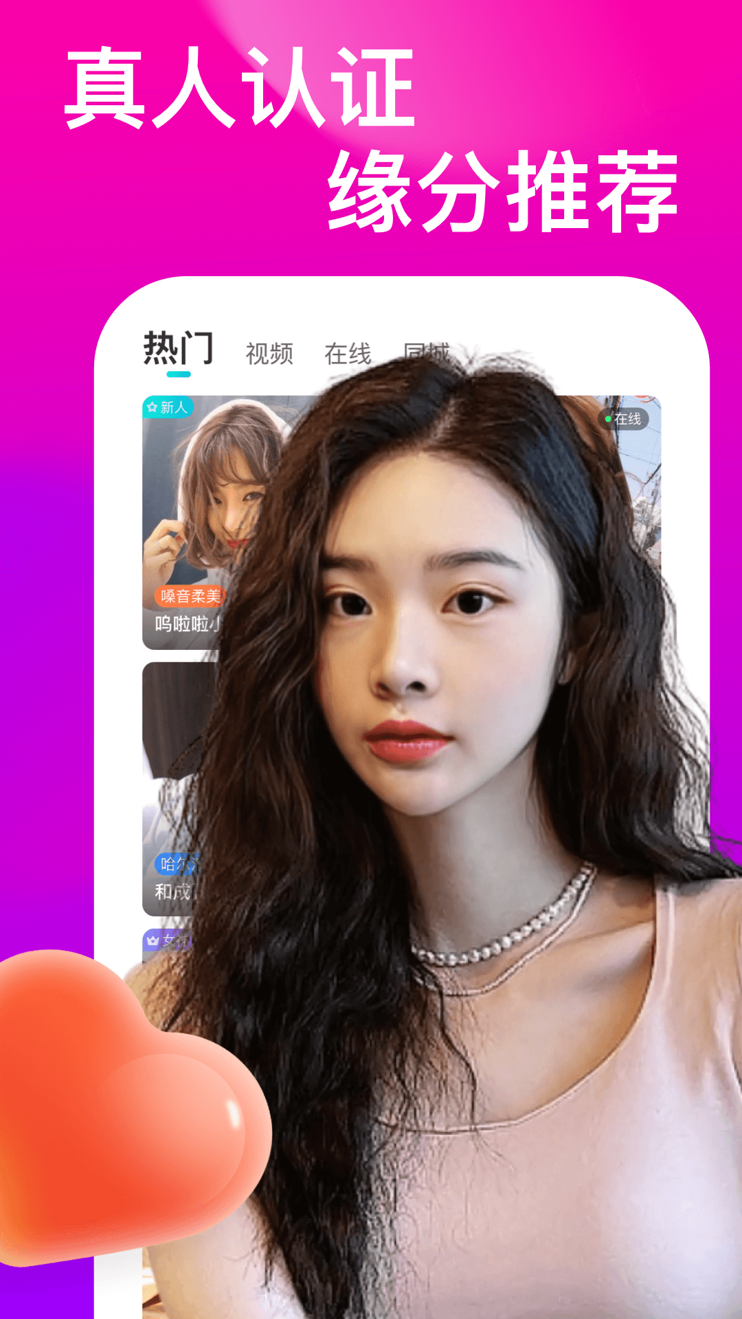 2、真实认证——自拍认证、语音认证、视频认证、实名认证,查看同城附近陌生人,即时聊天,在线处cp。