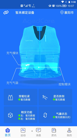 1,安护宁app中设计了独特的安全气囊内容来进行管理和开发的配套设备管理,实时检测气囊的状态来保护老年人的身体健康,采集各种身体数据,提前预知问题。
