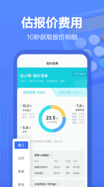 1、大数据自动进行计算,10秒钟都可以快速进行装修设计,更加方便地看到不同的认证信息,感受到家装信息的管理;