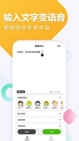 配音圈app是一款拥有超级实用的文字转语音管理的使用服务模式来进行设计的软件,软件上可以随时进行不同类型的真人配音来为文字段落进行选择,文本范例还有文字转化成语音,服务用户自己可以更加精确的来进行选择和使用,精确发音支持多语音模式。