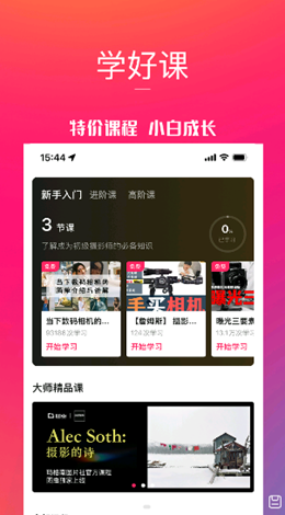 2,不通过类型的素材和文件资料作为丰富的课程提供模式,用户可以按照自己的摄影谁进行选择和管理,包括新手入门到进阶和大师课程,循序渐进的提高自己的能力。