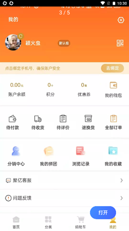 3,优惠的流程购物模式可以体验到更加轻松的购物步骤,拼团服务模式进行商品更新,分销中心的合作模式可以来进行商品的推广,赚取收益。