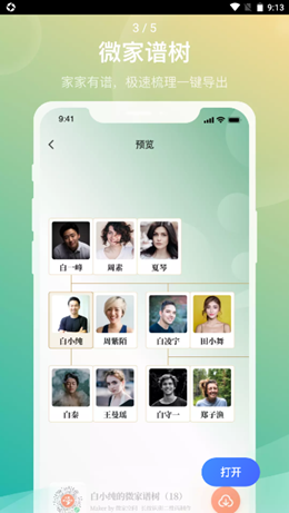 2,软件建立了非常庞大的预览家谱模式,家家都可以作为一个有谱的交流模式,急速的梳理自己的进行导出和更新,可以预览自己的家庭关系。