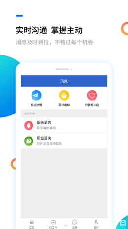 2,求职者以及不同类型的招聘者都可以在线进行简洁的互动,无论是职位的问题还是对方的要求和话题沟通,在线聊天就可以达成面试的需求。