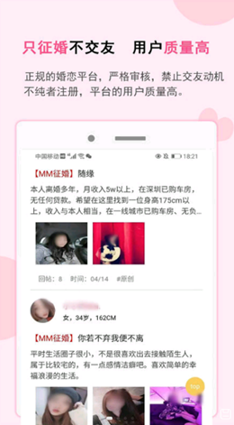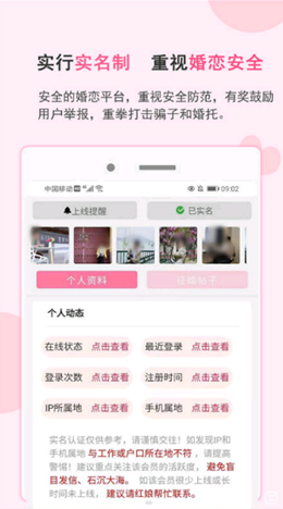 2,平台上建立了非常高级的实名数据资料来进行正好的检验,保证所有的资料内容都是真实有效的,可以诚信的开启后续的各种交友服务。