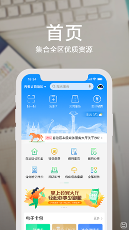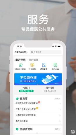 1,蒙速办app中构建了非常高级的主页面模式,将用户常用的主要功能进行指引和汇聚,从办理政务到社保医保缴费都有明确的指引,方便用户选择使用。