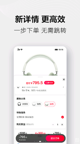 3,高效率的商品购物模式建立了一步下单的服务模式,不需要多余的页面展示就可以清晰的看到商品的详情方便挑选。