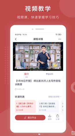 2,独创的视频课程内容的资料都是非常丰富的,不仅能够传递给用户更加全面的写作技巧,还可以建立自己体系化的学习,步步提高。
