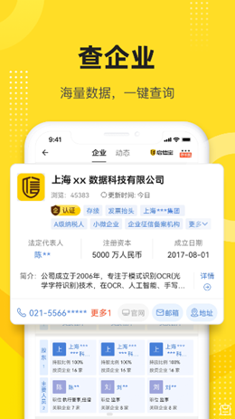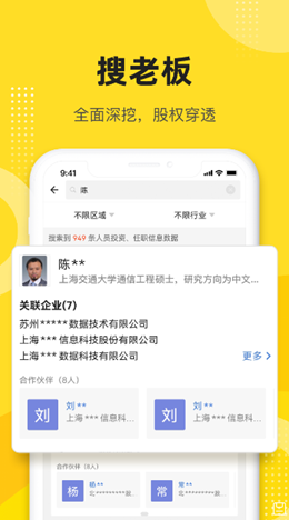 2,合作的企业相关会有非常多元化的同领域企业的互动客户,招聘和司法信息都有齐全的记录和更新,查询可以合作的人。