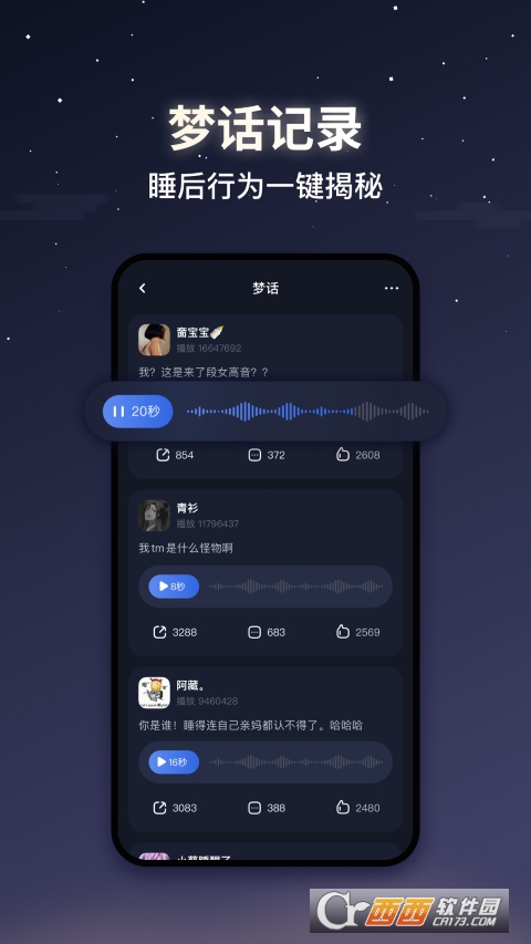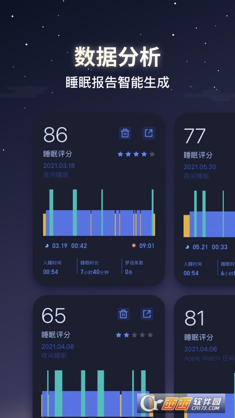 1.记录梦话与呼噜2.分析睡眠状态3.形成睡眠分析报告4.睡眠音乐帮你入睡5.智能闹钟清晨唤醒软件适用于: