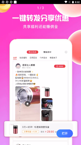 3,平台上建立了超级多样化的推广福利内容,用户自己可以在购物的同时选择不同情况的文案进行推广,分享链接之后可以赚取佣金。