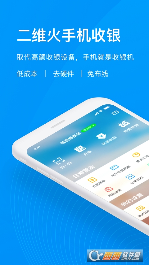 手机收银,免硬件、免布线,让硬件统统走开。只需手机安装二维火收银APP,无需其他传统收银硬件设备即可收银。