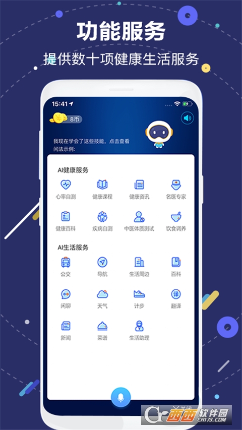 国寿AI健康是为您私人订制的智能健康小秘书。她提供了丰富实用的健康功能,包括权威专家健康知识、心率测试、疾病自测等,满足您对健康管理的多种需求,还能根据您的需求,主动推送你需要的内容。她还是你贴心的生活助理,查天气、导航、周边、美食无所不能,可以回答你的任何问题;它不仅是一个语音助手,更是真正智能的生活帮手。软件功能