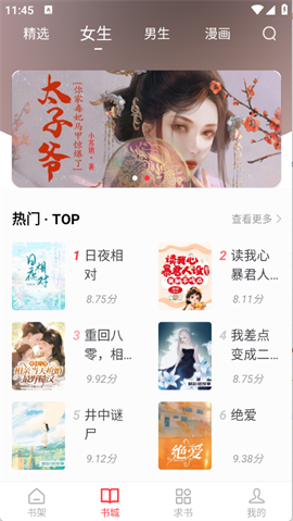 海量精品漫画小说资源,喜欢的作品都可以直接添加到书架,随时随地开启追书体验,实时更新热门榜单,发现更多精彩内容
