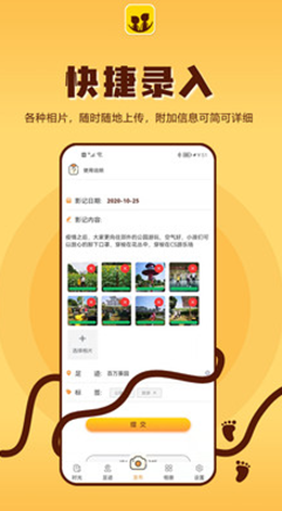 3,趣味的足迹大地图模式可以通过地图的展示效果看到孩子成长过程中去过的地方,汇聚所有地方进行足迹演示,看到回忆。