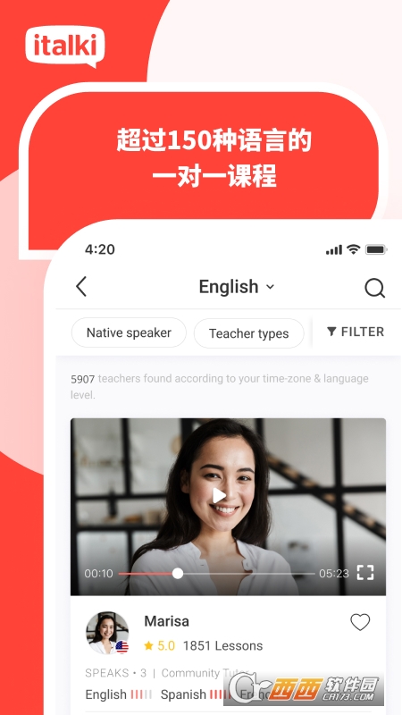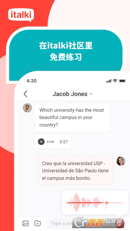 【独特的外语学习体验】正在学习英法德西日韩俄意葡等各种外语吗?很难找到纯正的母语外教吗?担心动辄数万元的高昂学费吗?不用担心,现在就来italki和来自全球200多个国家和地区的学生一起提高外语水平。Italki提供母语教师 1 对 1 真人在线上课,已有数百万学生选择的全语种私教授课平台与全世界一起学习外语!软件优势