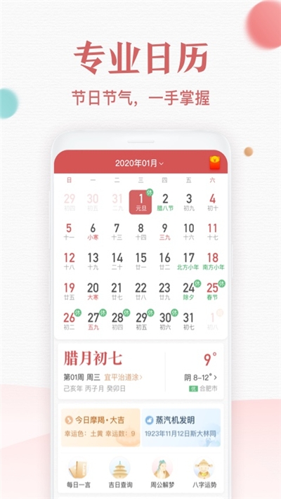 万年历、日历、农历、黄历、假期安排、天气预报、记事提醒便捷查看,一目了然!万年历黄历传承了中国数千前的宝贵历史文化,将日历,黄历,生肖,八字,方位结合在一起,加上现代人关心的天气,备忘,节假信息,形成一个博古通今的现代版黄历。诸葛万年历天气预报功能: