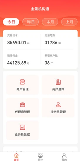 全景商户通app是一款可以更快的进行不同类型的业务记录和统计管理的软件,软件中拥有非常完善的交易流水监控模式,把握每个不同类型的项目组之间的协调和进度管控,轻松的查看商户的进度进件,还可以跟踪商户交易的数据,管理收益更便利。