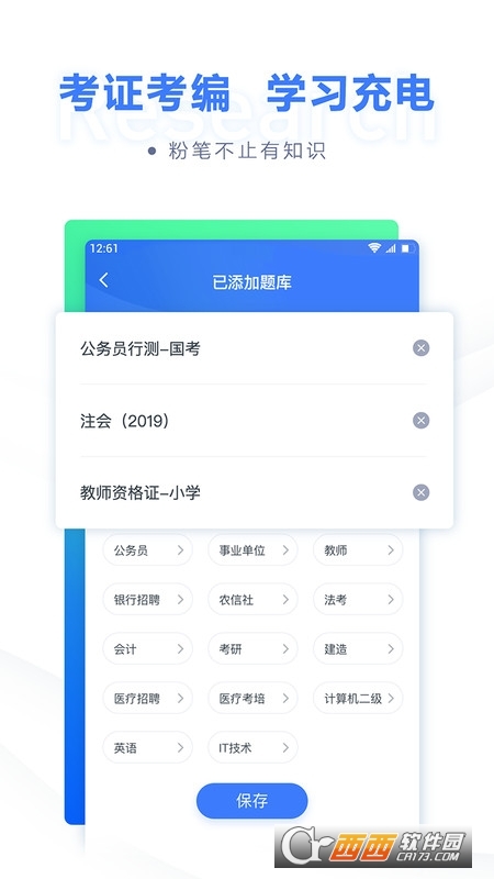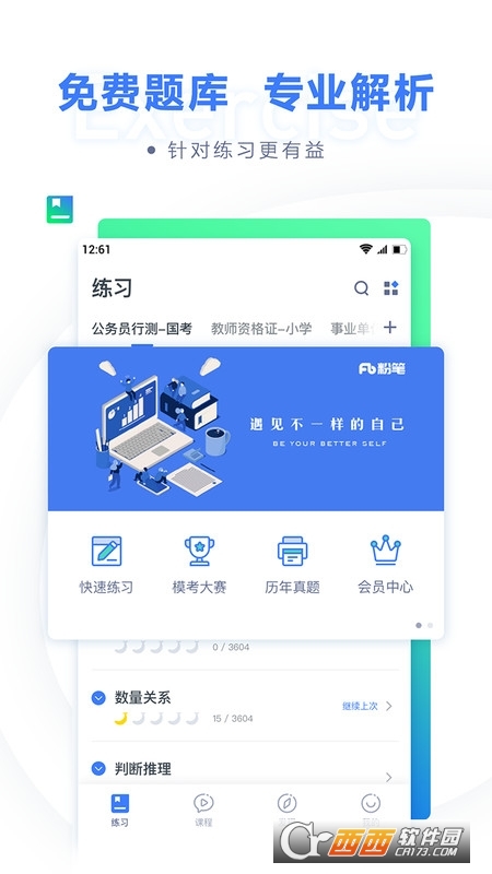 粉笔职教app真正的白考干货神器,各种公考,省考,法考,考研等等学习资料,学习内容都在这里,帮助你快速复习,了解最新的考试资讯,还有强大的模考助手帮助你测试自身水平!下载粉笔职教app让开始更轻松!