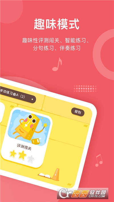 【评测闯关】评测闯关以一种轻松闯关模式增加了学琴的趣味性,让学生在趣味探索中加强练习