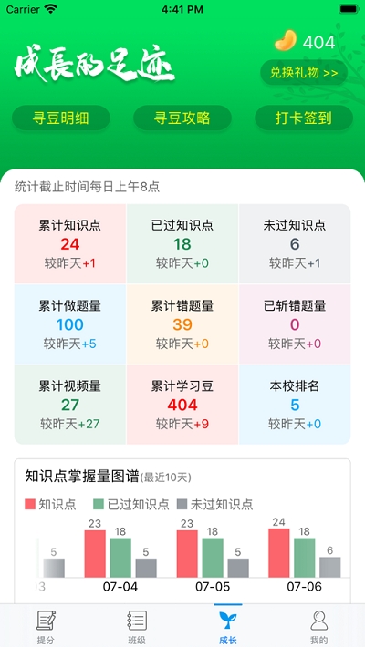 6:增加成长模块,学生学习整体报表实时呈现,总计学习多少知识点,已过多少,未过多少,错题多少,已过多少未过多少,视频学习多少,学习豆增加多少等等,各种数据实时统计分析,让学生了解薄弱点在哪里,实时提升;