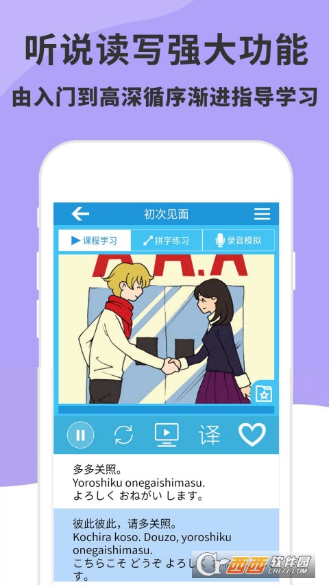 本APP主要由日语发音入门、语音规则、分类词汇、基础语法、句型、常用会话等内容组成。可从零起步、循序渐进,每天15分钟,轻轻松松由入门学到精通。