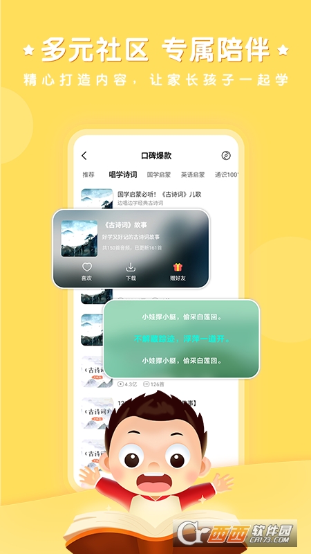 常青藤爸爸早教app是专门为0到6岁的儿童打造的英语绘本应用,软件配合了近200本实体英文绘本,30多本中文寓言以及100多本国学儿歌,不断提高孩子的语言启蒙认知能力,需要的朋友可以来鳄斗163下载常青藤爸爸app进行使用