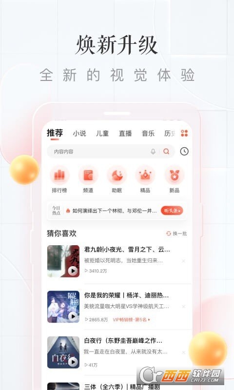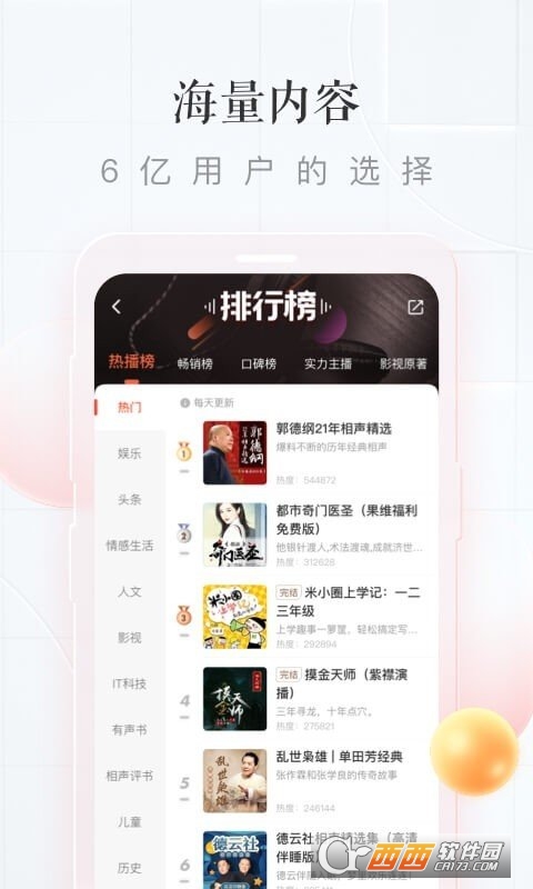 喜马拉雅是一款很不错的国内音频分享电台,目前用户已达到3.5亿人,音频内容种类丰富,有名人大家有声阅读,别具一格的内容,海量好质量有声阅读等你选择,一个人静下来的时候,听听电台,让你的心灵被温暖包裹,也有小说和各种经典搞笑听不够,赶紧下载体验吧!