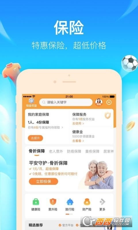 【保险购买】用户可以在首页、产品菜单栏中选择优质的保险产品购买,也可以领取免费的保险,并且在第一次注册时可以领取到保险折扣券。