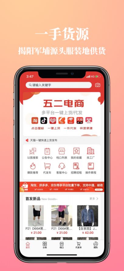 3、五二电商平台是一个集代发,搜款,上货为一体的服装鞋帽批发商城。