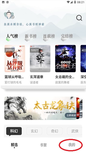 1、打开旷野书屋软件,进入主页面。