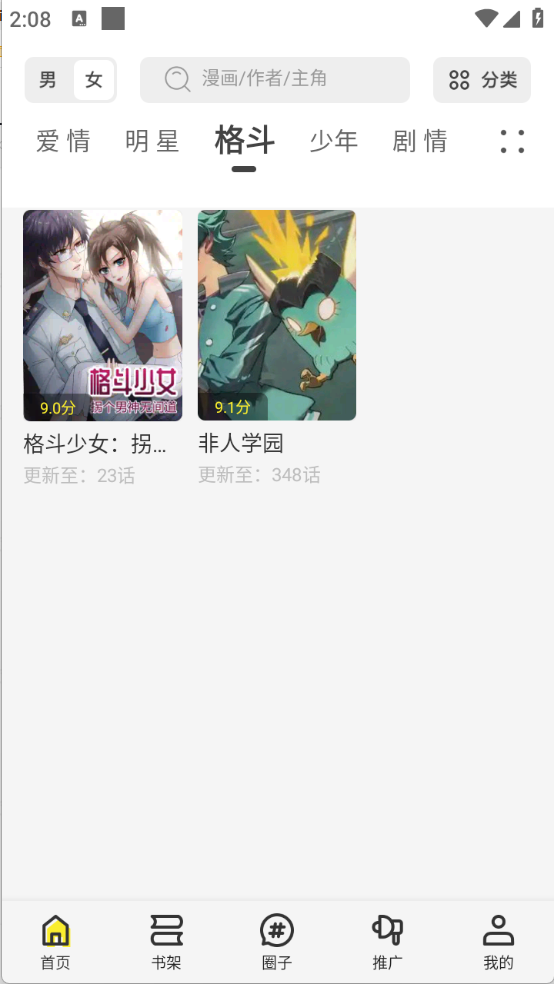 2、首页顶部栏中汇集了很多的资源类型,包括爱情、格斗以及少年等类型。