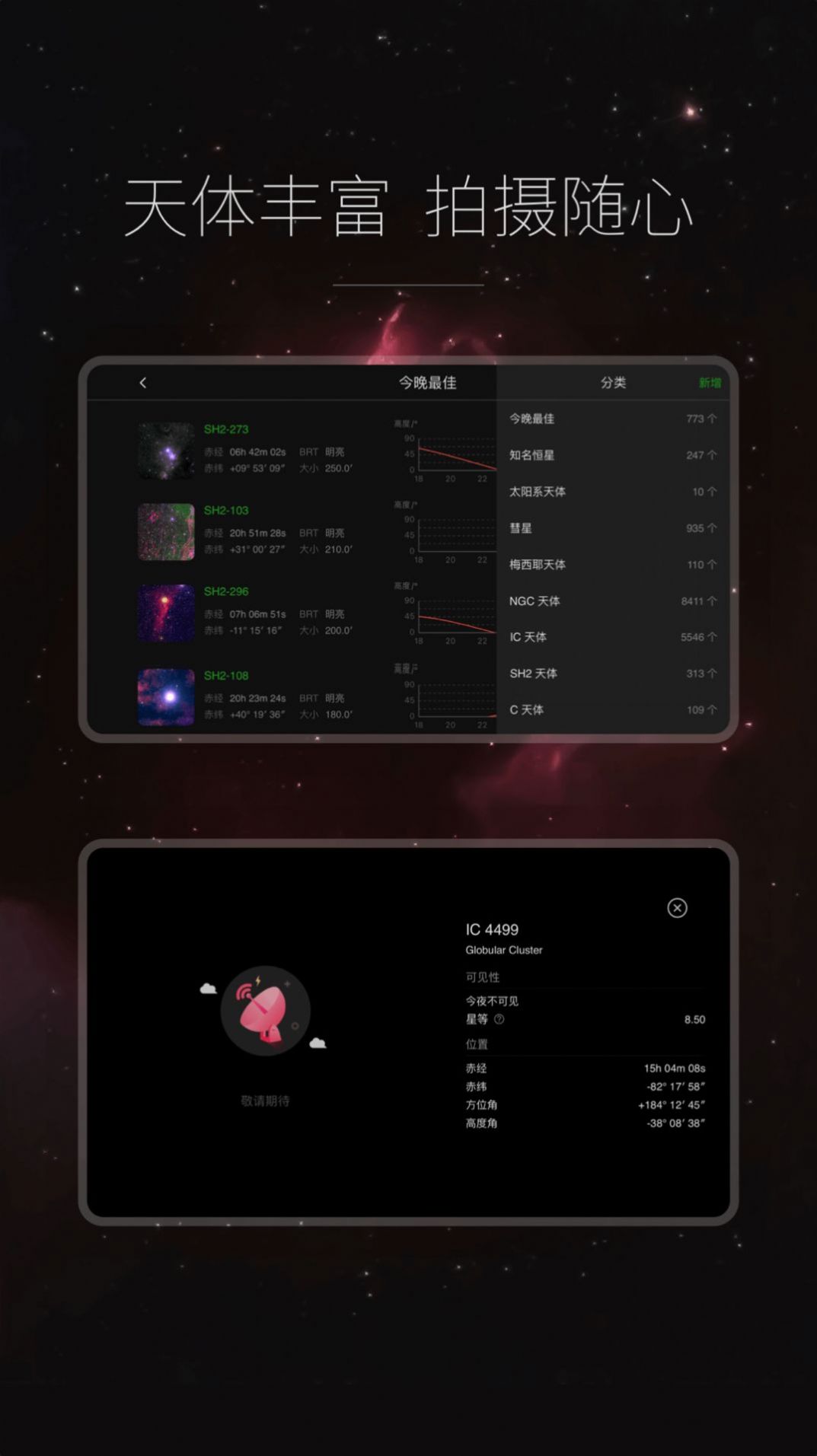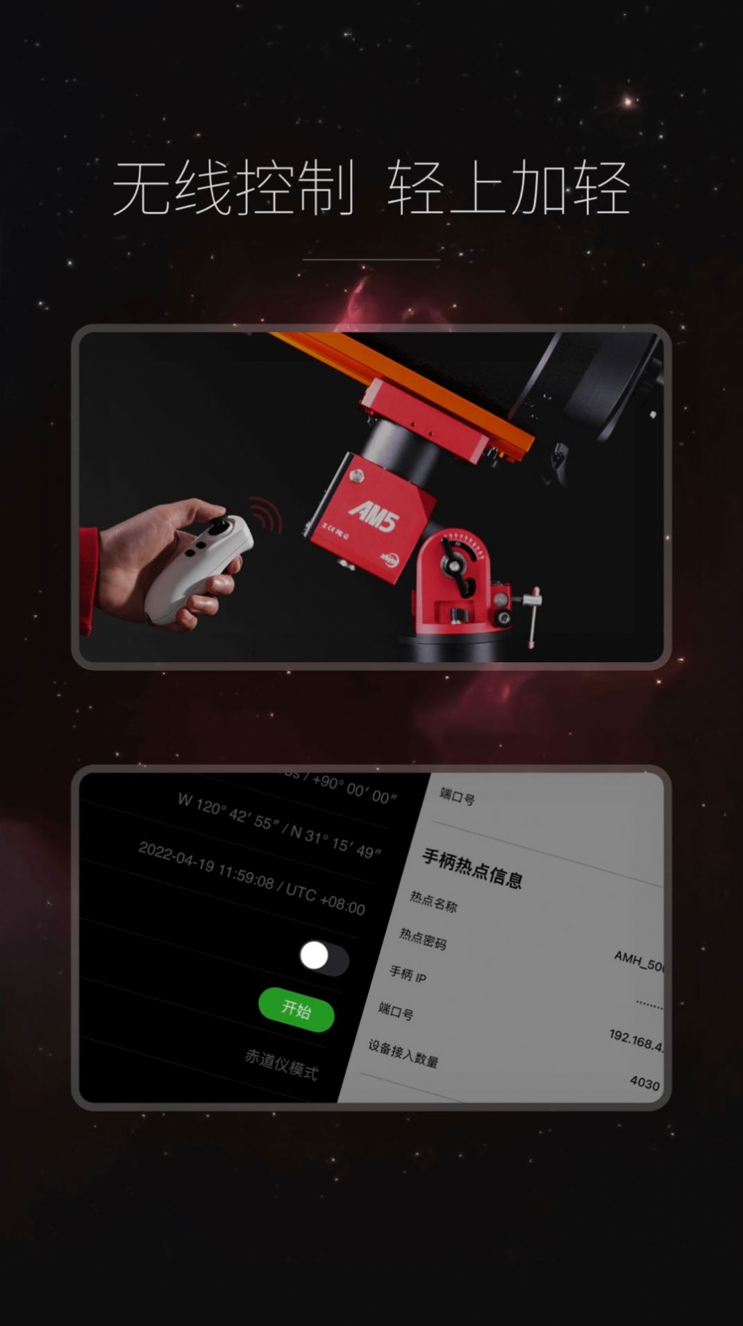 2、连接 AMH 无线网络后,可通过 App 内的星空地图、今晚最佳等功能。