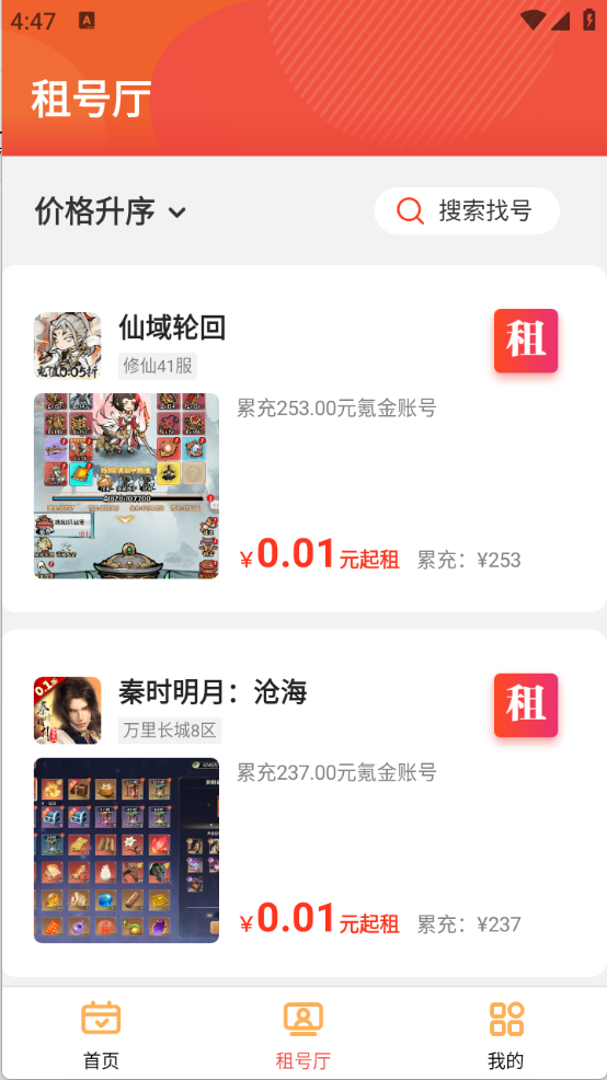 4、“租号厅”可以按照最新上架、价格升序以及价格降序进行排列。