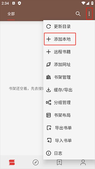 1、打开本站下载阅读app最新版小说,进入软件后,书架界面最右上角三个点 ⋮ 图标,然后点击添加本地。