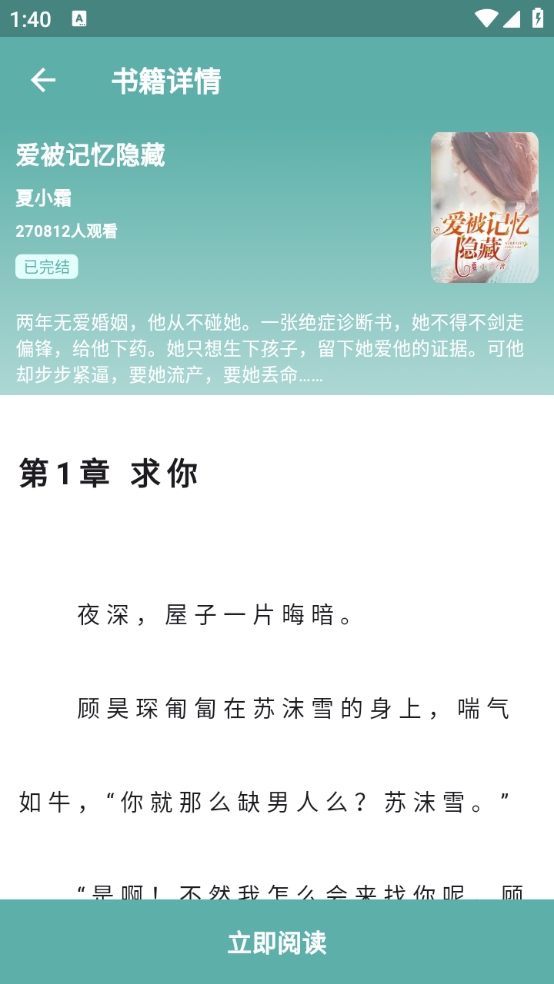 4、用户挑选好想看的小说之后直接点开,点击“立即阅读”。