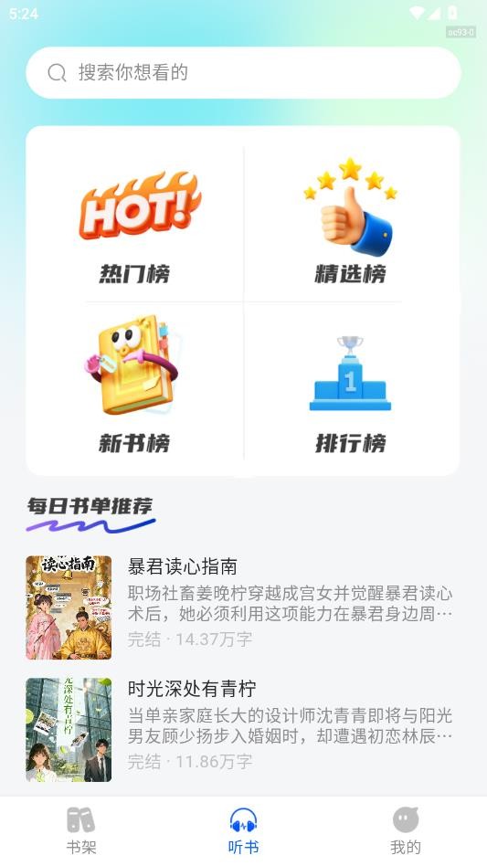 在听书页面可以根据榜单可以快速筛选优质作品。
