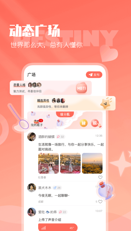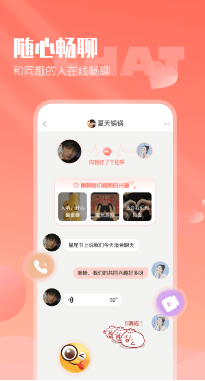 1、为用户们提供有多种不同的互动交友方式,从聊天开始,邂逅缘分。