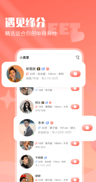 1、根据兴趣偏好,快速推荐心动类型,帮助更快找到心仪的另一半。