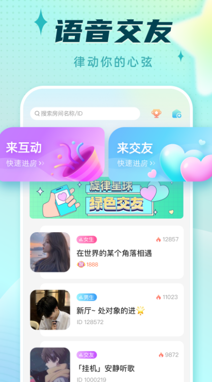 旋律星球app,这是一款可以在线找到自己心仪对象的手机交友软件,线上为大家提供了很多好玩的交友互动玩法,都是可以让大家很简单进行趣味互动社交的,享受优质的交友服务非常不错哦,直接就可以让大家更快速在手机上认识到很多的优质单身异性,线上自由互动社交十分简单有趣!