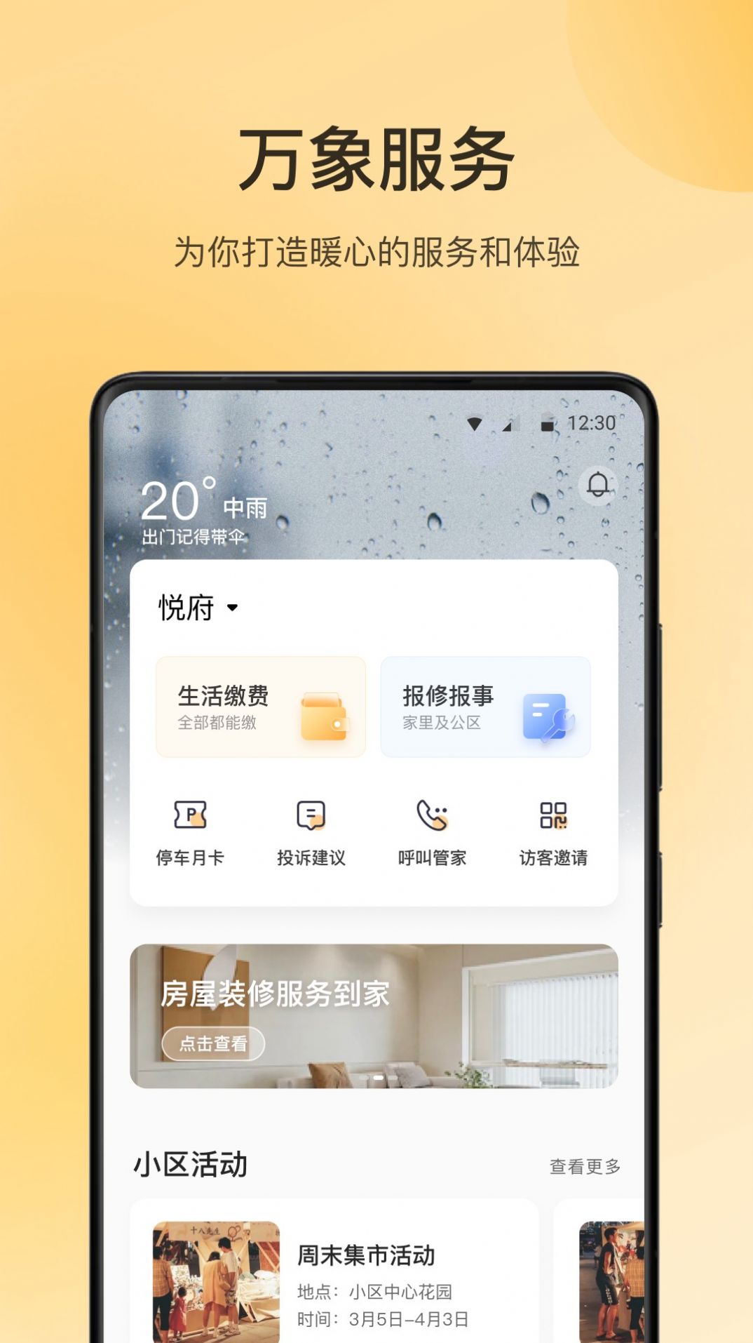 万象服务APP是款很不错的现代化社区管理助手,软件功能十分强大,涵盖了多种物业的管理服务,随时随地在线操作使用,满足不同用户的使用需求,给大家带来了更多的便利,让你随时在线进行使用,高效率的物业管理,是小区必备的神器,在线一键使用。