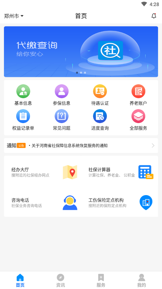 河南社保为河南省社保局官方客户端,为广大群众提供包括社保信息查询功能,社保局通知类信息展示功能,养老认证功能在内的诸多便民功能,欢迎下载使用!